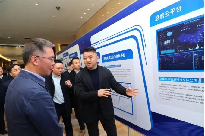 • 華辰智通總經理傅帝向湖南省工業和信息化廳黨組書記、廳長曹慧泉介紹思普云在工業領域應用情況